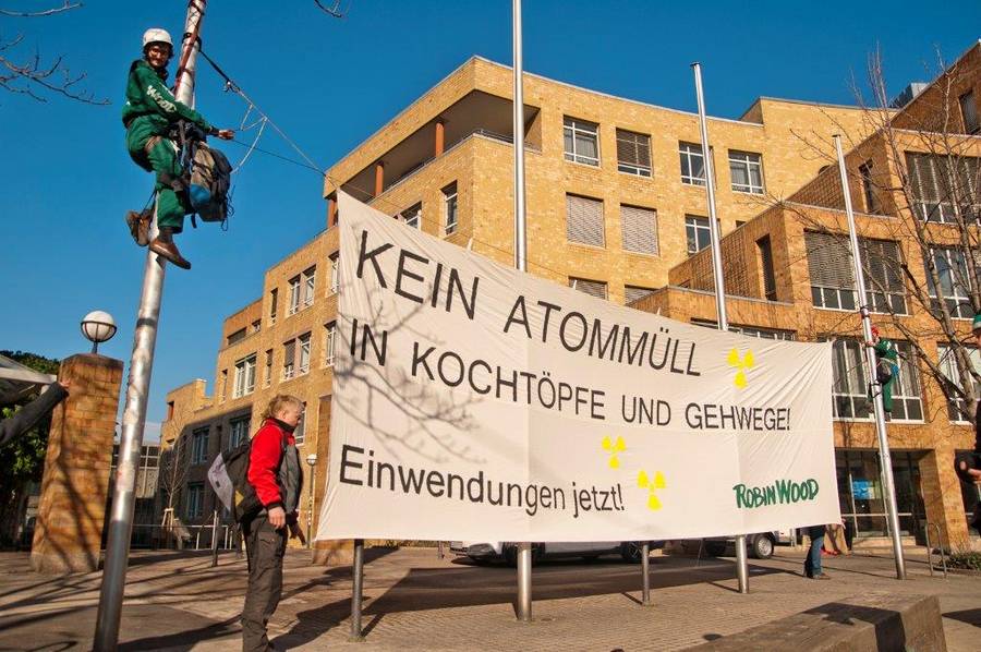 Weiterlesen: Mitmachen - 5 einfache SchritteWer unsere Forderungen nach mehr Verantwortung und Sicherheit beim Abriss der AKWs und beim Umgang mit dem Atom- und Abrissmüll unterstützen will, kann dies wie Robin Wood mit einer Kletteraktion vor dem Umweltministerium in Stuttgart tun: "Kein Atommüll in Kochtöpfe und Gehwege!" (Danke, Robin Wood! Foto: Robin Wood / Jens Volle. Video bei Fluegel.TV, Presseinfo bei Robin Wood).